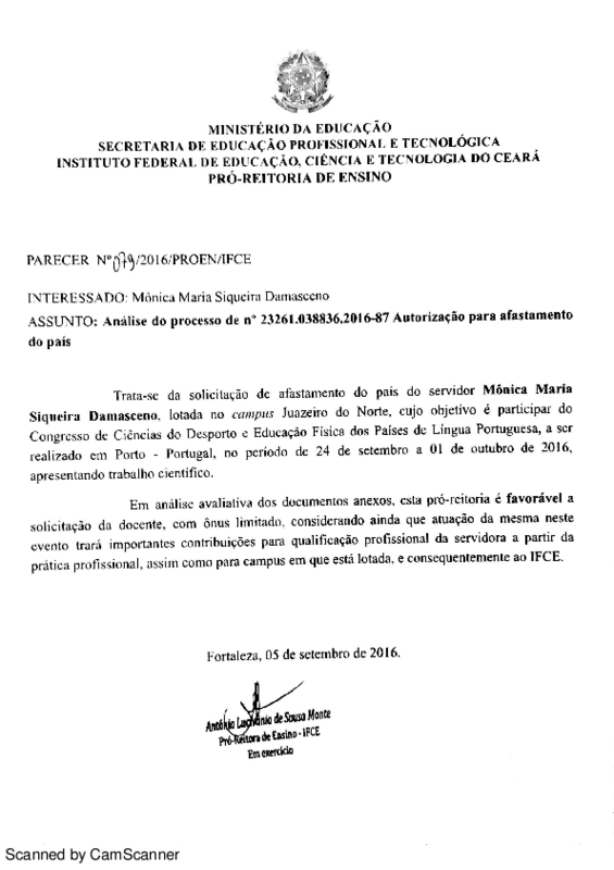 Processo 23261.038836.2016-87 - autorização para afastamento do país da servidora Mônica Maria Siqueira Damasceno - Campus Juazeiro.