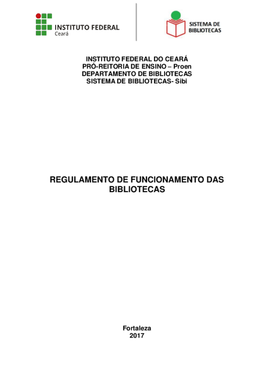 Este regulamento visa disciplinar os procedimentos de funcionamento das bibliotecas que compõem o Sistema de Bibliotecas do Instituto Federal do Ceará (Sibi), definindo sua estrutura organizacional e estabelecendo normas que regem e orientam as rotinas e os serviços por elas prestados.