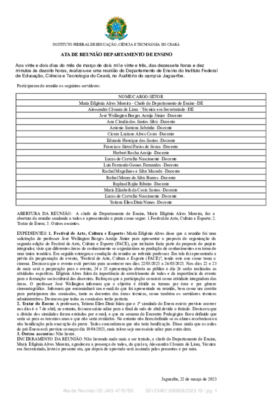 Pauta: Festival de Arte e Cultura; Tratar do Enem.