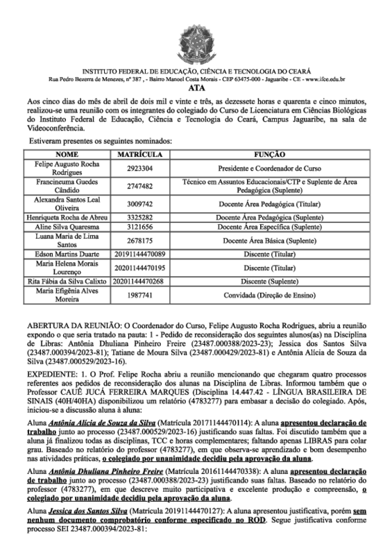Pedir reconsideração dos seguintes alunos(as) na Disciplina de Libras