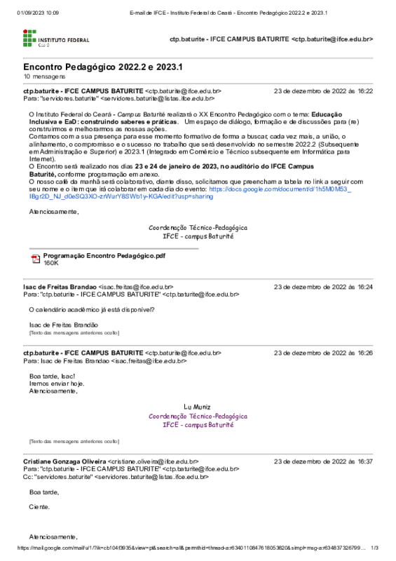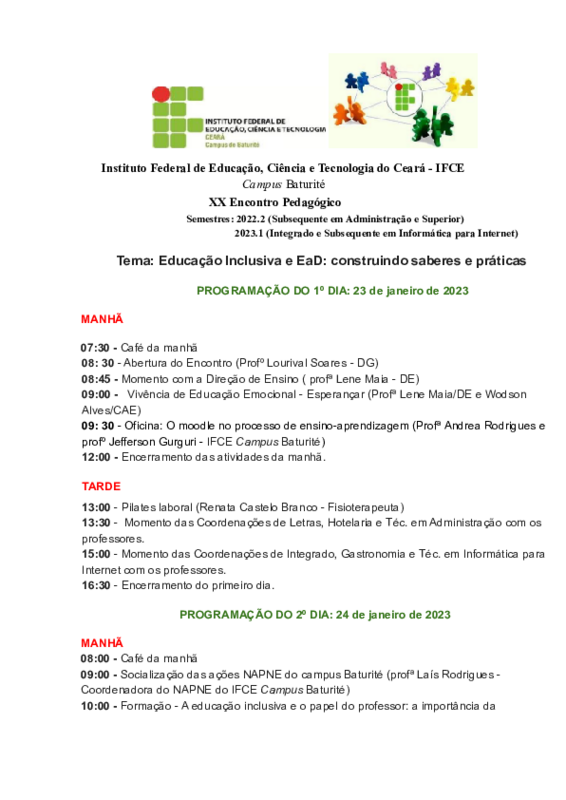 O Encontro foi realizado nos dias 23 e 24 de janeiro de 2023, no auditório do IFCE Campus Baturité, conforme programação em anexo.
