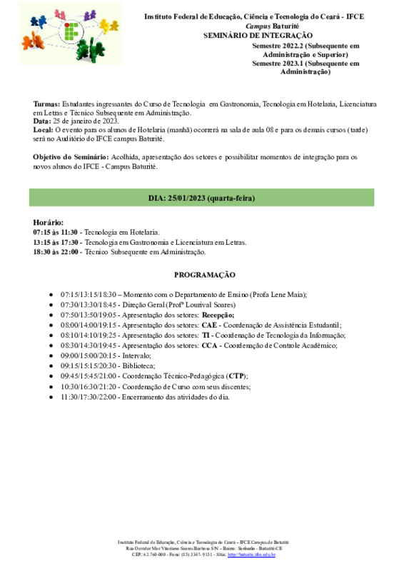 Local: O evento para os alunos de Hotelaria (manhã) ocorrerá na sala de aula 08 e para os demais cursos (tarde)