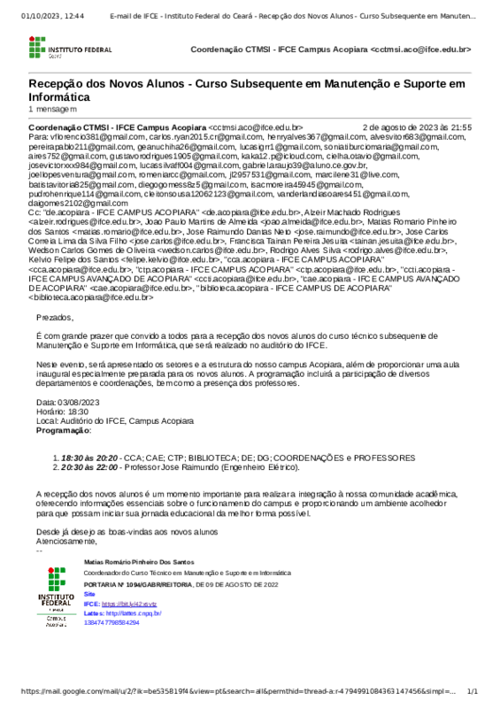 Em reuniões semestrais, reunimos tanto os novos alunos quanto aqueles que já estão há mais tempo no IFCE para realizar uma ação colaborativa e participativa de recepção. Entre as atividades planejadas, incluímos a apresentação do corpo docente, os setores que desempenham um papel fundamental para o funcionamento do IFCE e todas as instalações disponíveis, incluindo salas e laboratórios.