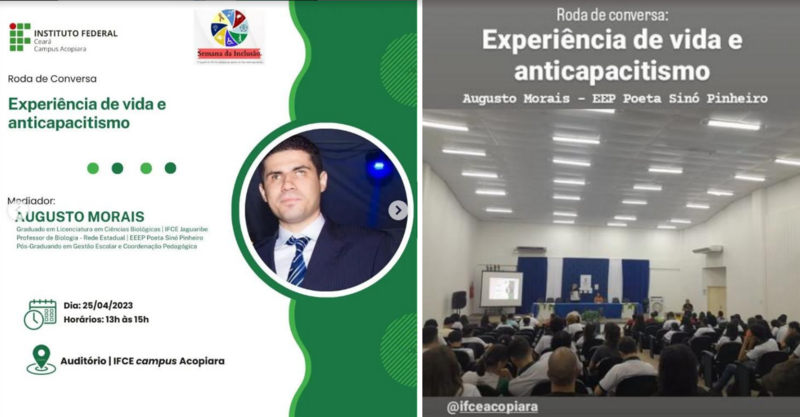 A Roda de Conversa “Experiência de Vida e Anticapacitismo” foi um encontro interativo e participativo ministrado por Augusto Morais que teve como objetivo promover diálogos e reflexões sobre a realidade das pessoas com diferentes tipos de capacidades. Durante a roda de conversa, os participantes compartilham suas experiências de vida, desafios enfrentados e conquistas alcançadas no contexto da inclusão social e da luta contra a discriminação e preconceito relacionados à capacidade.