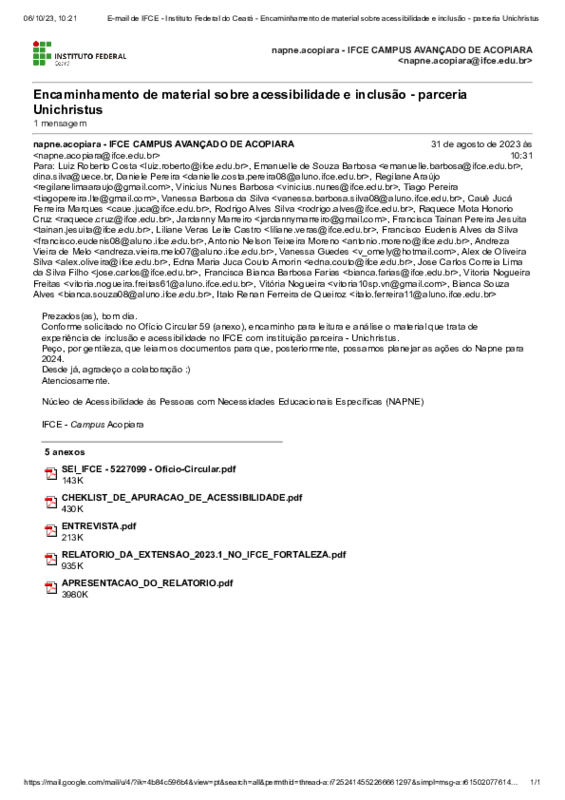 Compartilhamento de materiais tratando de experiências de inclusão e acessibilidade no IFCE com instituição parceira - Unichristus. Tais documentos podem ajudar no planejamento de ações do Napne no campus Acopiara.