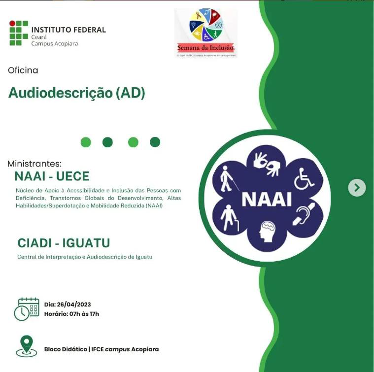 A Oficina “Audiodescrição (AD)” foi um evento educacional ministrado pelo Núcleo de Apoio à Acessibilidade e Inclusão das Pessoas com Deficiência, Transtornos Globais do Desenvolvimento, Altas Habilidades/Superdotação e Mobilidade Reduzida (NAAI), Central de Interpretação e Audiodescrição de Iguatu (CIADI - Iguatu) e Universidade Estadual do Ceará (UECE) que se concentrou em explorar e ensinar a técnica de audiodescrição, um recurso fundamental para tornar conteúdos visuais acessíveis para pessoas com deficiência visual. Durante a oficina, os participantes aprenderam sobre os princípios, técnicas e práticas da audiodescrição, bem como suas aplicações em diferentes contextos, como filmes, séries, exposições, teatro e outros eventos visuais.