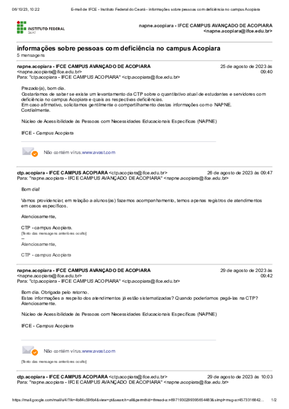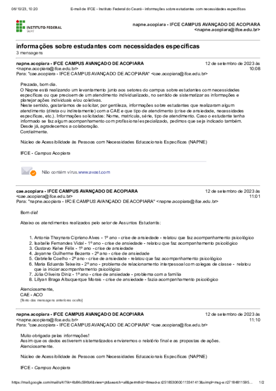 O Napne solicitou junto ao Departamento de Ensino, CAE e CTP informações sobre os estudantes com necessidades específicas. Com base nestas informações será elaborado um documento contendo o planejamento de estratégias educacionais direcionadas e proposição de ações de capacitação de servidores no tocante ao atendimento e acompanhamento dos discentes.