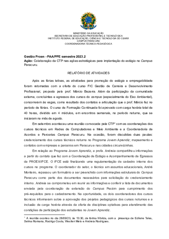 Dar continuidade ao processo de colaboração na implantação da política de estágio do campus Paracuru - Semestre Letivo 2023.2