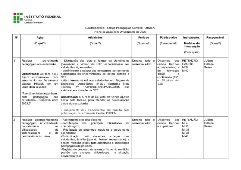 - Planejamento das atividades do setor considerando as atribuições definidas institucionalmente (Nota Técnica nº 003/2015/PROEN/IFCE), as metas e demandas do Ensino do campus Paracuru;