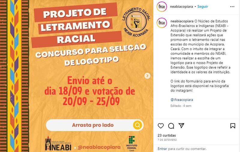 De 18/09/2023 a 25/09/2023 - Com o intuito de integrar a comunidade e membros do NEABI, será realizada a escolha de um logotipo para o Projeto de Letramento Racial. Este logotipo deve refletir a identidade e os valores da instituição.