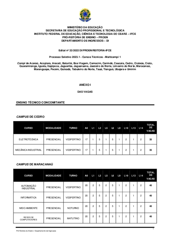 Garantir a oferta de vagas para o curso Técnico Integrado em Comércio nos semestres 2023.1, conforme determinado no projeto pedagógico do curso.