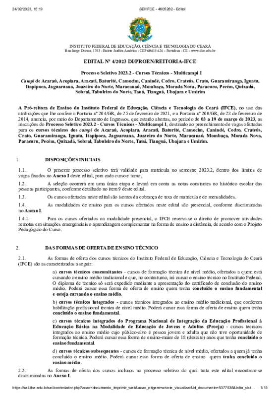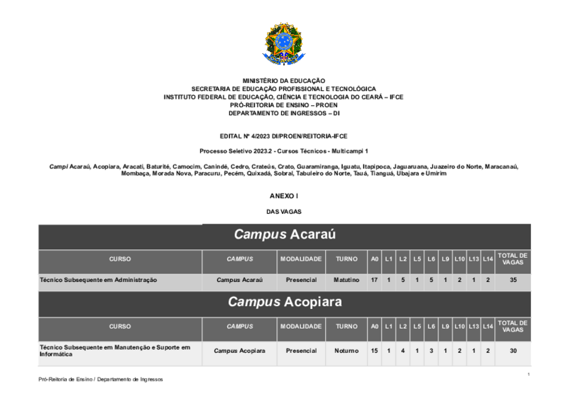Garantir a oferta de vagas para o curso Técnico Subsequente em Administração no semestre 2023.2, conforme determinado no projeto pedagógico do curso.
