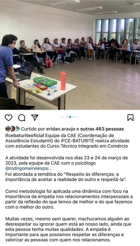 A ação incentiva os docentes e discentes a promoverem e participarem de eventos voltados a áreas técnicos e científicos, além de promover o cuidado com os estudantes e seu futuro.