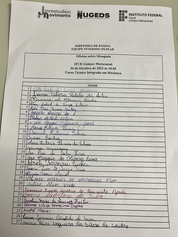 Psicologia e NUGEDS realizaram uma oficina com os discentes do primeiro ano do curso técnico integrado em Mecânica com o objetivo de refletir sobre a construção e manutenção da misoginia na sociedade.