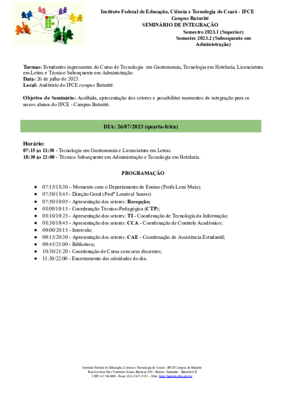 O evento tem o objetivo de acolher e apresentar os setores e possibilitar momentos de integração para os novos alunos do IFCE - Campus Baturité.