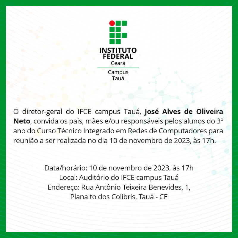 Reunião de pais/mães e/ou responsáveis pelos alunos da turma do 3º ano do Curso Técnico Integrado em Redes de Computadores.
