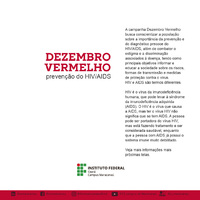 A campanha Dezembro Vermelho busca conscientizar a população sobre a importância da prevenção e do diagnóstico precoce do HIV/AIDS, além de combater o estigma e a discriminação associados à doença, tendo como principais objetivos informar e educar a sociedade sobre os riscos, formas de transmissão e medidas de proteção contra o vírus. Sendo assim o Dezembro Vermelho foi pensado na forma de construção de cards para serem divulgados nas redes sociais do Campus, visto que os alunos e professores estão em período de fim semestre de 2023.