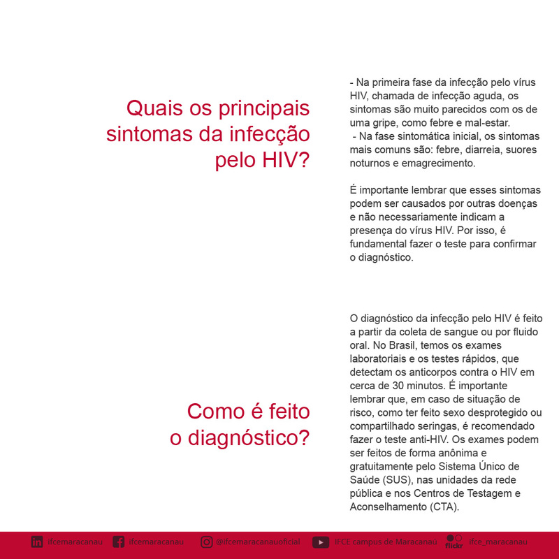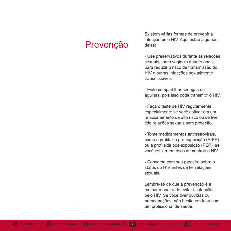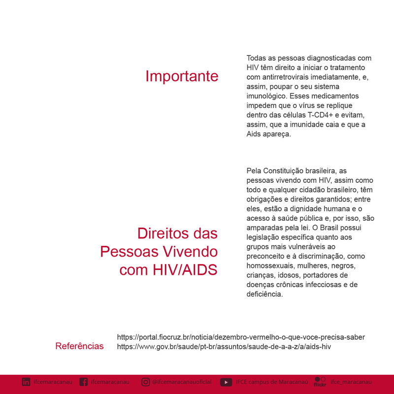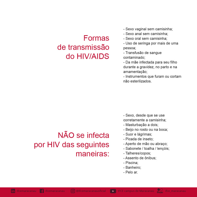 A campanha Dezembro Vermelho busca conscientizar a população sobre a importância da prevenção e do diagnóstico precoce do HIV/AIDS, além de combater o estigma e a discriminação associados à doença, tendo como principais objetivos informar e educar a sociedade sobre os riscos, formas de transmissão e medidas de proteção contra o vírus. Sendo assim o Dezembro Vermelho foi pensado na forma de construção de cards para serem divulgados nas redes sociais do Campus, visto que os alunos e professores estão em período de fim semestre de 2023.