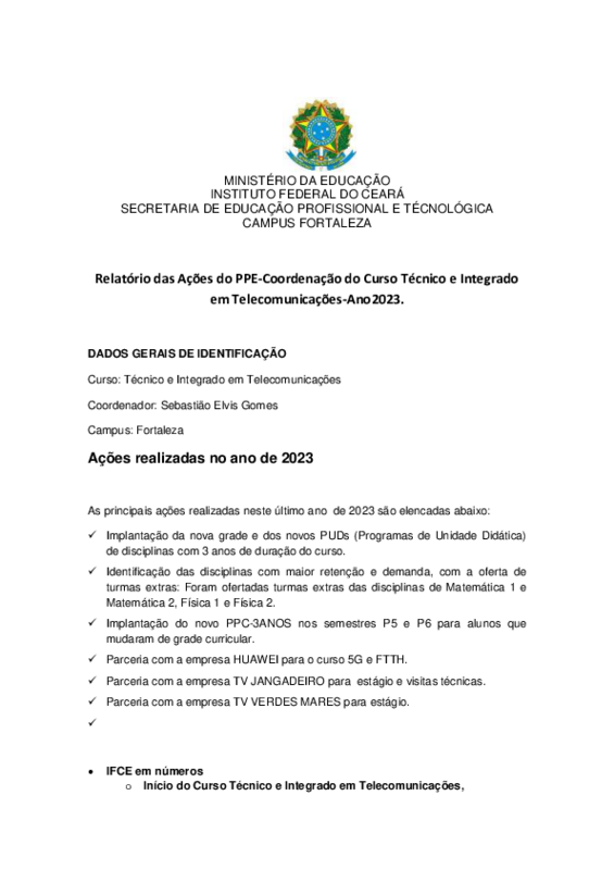 PAA-Ação PPE #152173: Plano de Ação da Coordenação do Curso Técnico e Integrado em Telecomunicações - Ano2023