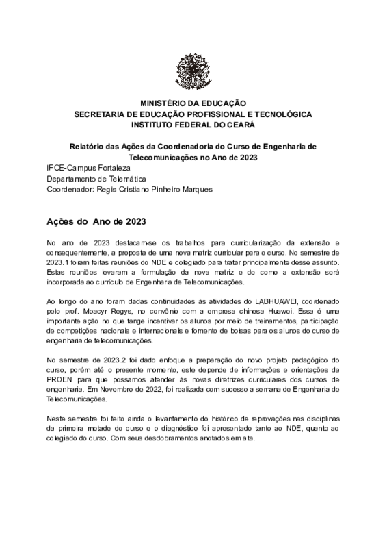 AbertaRelatório das ações de 2023 da Coordenadoria do Curso Bacharelado em Engenharia de Telecomunicações
