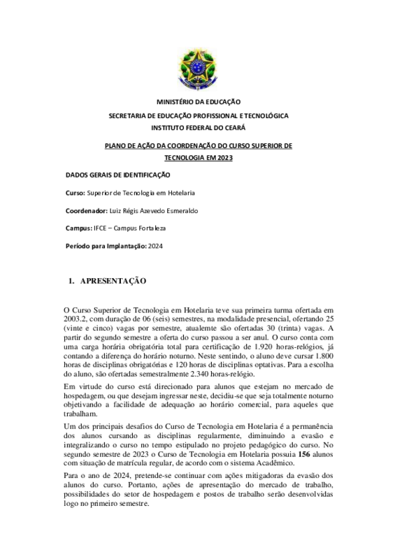 PLANO DE AÇÃO DE COORDENADOR DE CURSO SUPERIOR DE TECNOLOGIA EM HOTELARIA CAMPUS FORTALEZA