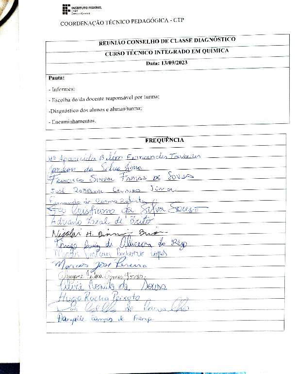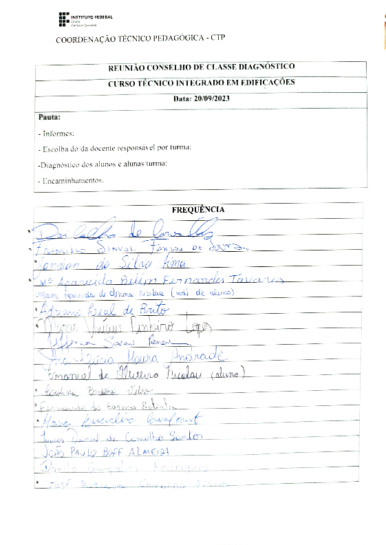 AbertaRealizar reuniões sistemáticas de Conselhos de Classe (semestre 2023.2) dos cursos Técnicos Integrados em Edificações e Química.