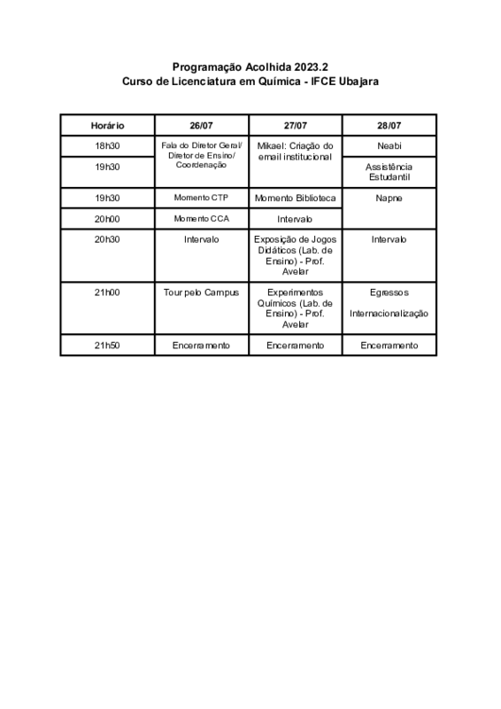 Entre os dias 26/07 e 28/07 foi realizada a Acolhida dos alunos 2023.2 do curso de Licenciatura em Quimica - IFCE Campus Ubajara. Um momento para recepcionar os novos alunos ingressantes no curso e apresentar a instituição.