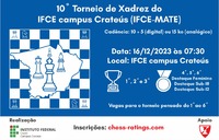 O 10º Torneio de Xadrez do IFCE Campus Crateús (IFCE-MATE) é um torneio aberto a qualquer enxadrista que manifeste interesse em participar do evento, devendo, apenas, fazer a inscrição e respeitar as regras estabelecidas neste no regulamento específico e as leis do xadrez. Esta competição marcará a abertura do 5552 - PROJETO DE EXTENSÃO DE XADREZ DO IFCE CAMPUS CRATEÚS _ IFCE-MATE (2023/2024) (será a primeira ação específica realizada por meio do projeto IFCE - MATE), que pretende retomar as atividades que outrora foram desenvolvidas na instituição, por meio de um programa de extensão realizado entre 2012 e 2018. O evento acontecerá no Instituto Federal de Educação, Ciência e Tecnologia do Ceará - campus Crateús, das 07:30 hs às 13:00 hs, do dia 16 de dezembro de 2023. Será utilizado o sistema de disputa suíço, gerenciado por meio do programa computacional Swiss Perfect 98, em 5 (cinco) ou 6 (seis) rodadas com tempo de reflexão, a depender da qualidade dos jogadores.