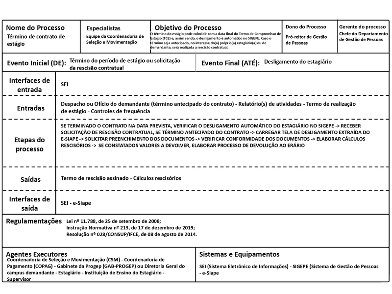 O término do estágio pode coincidir com a data final do Termo de Compromisso de Estágio (TCE) e, assim sendo, o desligamento é automático no SIGEPE. Caso o término seja antecipado, no interesse do(a) próprio(a) estagiário(a) ou do demandante, será realizada a rescisão contratual.