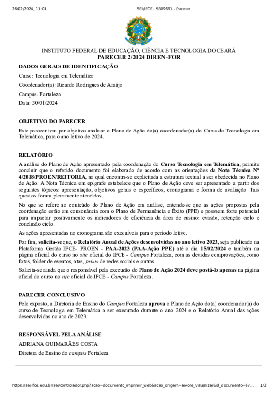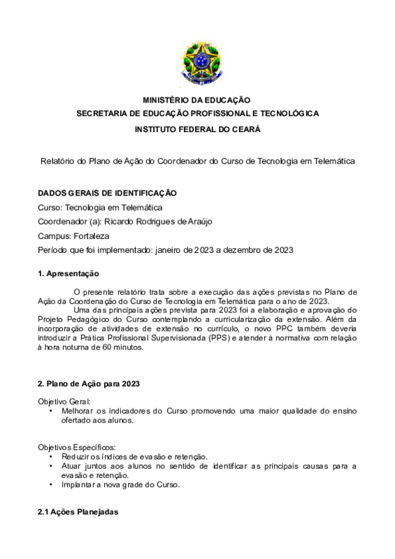 Relatório sobre as atividades realizadas no ano de 2023 pela Coordenadoria do Curso de Tecnologia em Telemática