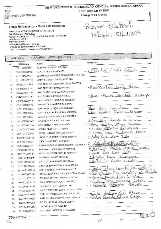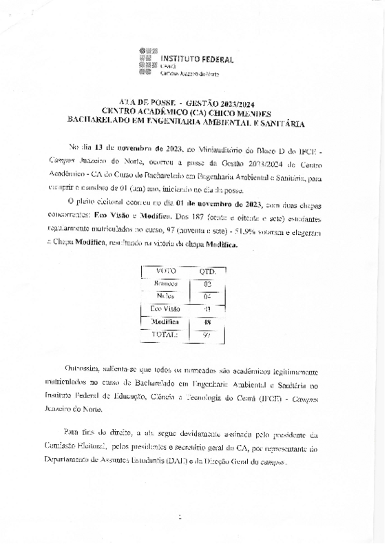 O Serviço de Assistência ao Educando, forneceu apoio administrativo (acesso aos recursos materiais da instituição), orientação técnica (legislação) e atuou como mediador de conflitos durante o processo eleitoral do Mandato 2023/2024 do Centro Acadêmico do Curso de Bacharelado em Engenharia Ambiental e Sanitária.