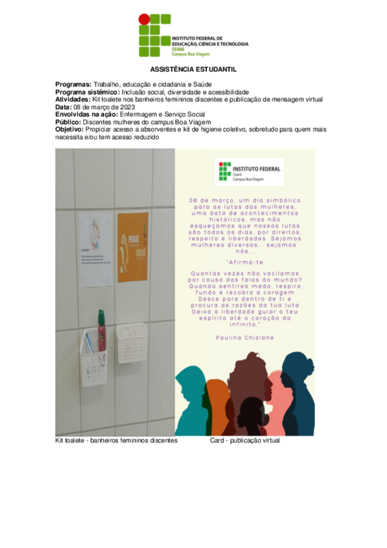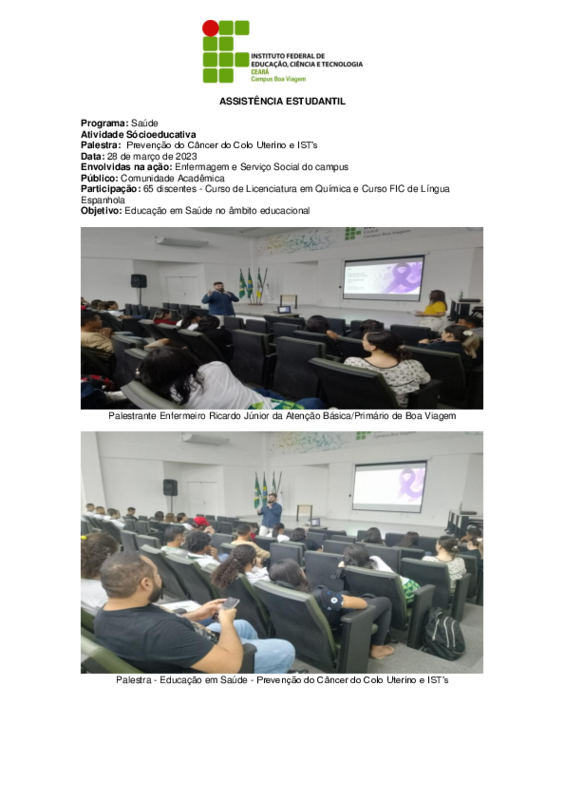 As atividades foram desenvolvidas da parceria entre Enfermagem (Keedi Jane até então enfermeira do campus Boa Viagem) e Serviço Social do campus Boa Viagem.
