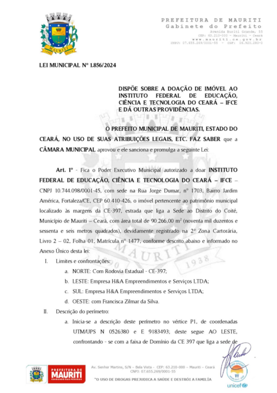 Publicação da Lei municipal que estabelece a doação do imóvel para o IFCE.