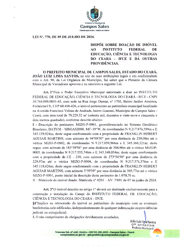 Publicação da Lei municipal que estabelece a doação do imóvel para o IFCE.