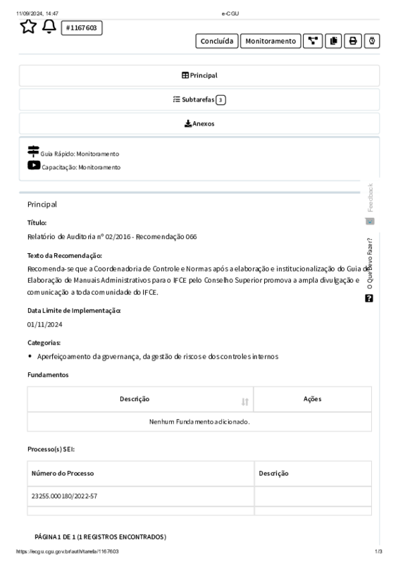 Ademais, a elaboração desse manual também é resultado do atendimento da recomendação ID n° 1167603 referente ao Relatório de Auditoria nº 02/2016 - Recomendação 066, com a conclusão do monitoramento pela Auditoria Interna em 26/08/2024.