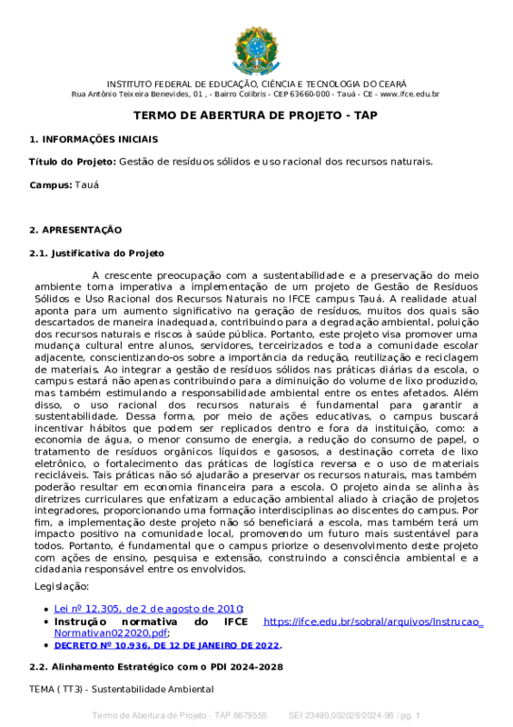 A crescente preocupação com a sustentabilidade e a preservação do meio ambiente torna imperativa a implementação de um projeto de Gestão de Resíduos Sólidos e Uso Racional dos Recursos Naturais no IFCE campus Tauá. A realidade atual aponta para um aumento significativo na geração de resíduos, muitos dos quais são descartados de maneira inadequada, contribuindo para a degradação ambiental, poluição dos recursos naturais e riscos à saúde pública. Portanto, este projeto visa promover uma mudança cultural entre alunos, servidores, terceirizados e toda a comunidade escolar adjacente, conscientizando-os sobre a importância da redução, reutilização e reciclagem de materiais. Ao integrar a gestão de resíduos sólidos nas práticas diárias da escola, o campus estará não apenas contribuindo para a diminuição do volume de lixo produzido, mas também estimulando a responsabilidade ambiental entre os entes afetados. Além disso, o uso racional dos recursos naturais é fundamental para garantir a sustentabilidade. Dessa forma, por meio de ações educativas, o campus buscará incentivar hábitos que podem ser replicados dentro e fora da instituição, como: a economia de água, o menor consumo de energia, a redução do consumo de papel, o tratamento de resíduos orgânicos líquidos e gasosos, a destinação correta de lixo eletrônico, o fortalecimento das práticas de logística reversa e o uso de materiais recicláveis. Tais práticas não só ajudarão a preservar os recursos naturais, mas também poderão resultar em economia financeira para a escola. O projeto ainda se alinha às diretrizes curriculares que enfatizam a educação ambiental aliado à criação de projetos integradores, proporcionando uma formação interdisciplinas ao discentes do campus. Por fim, a implementação deste projeto não só beneficiará a escola, mas também terá um impacto positivo na comunidade local, promovendo um futuro mais sustentável para todos. Portanto, é fundamental que o campus priorize o desenvolvimento deste projeto com ações de ensino, pesquisa e extensão, construindo a consciência ambiental e a cidadania responsável entre os envolvidos.