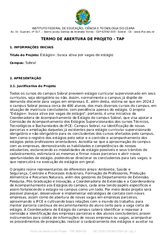 O presente projeto pretende obter novas parcerias empresariais e vagas de estágio, direcionar alunos aptos para ocupar as vagas disponibilizadas e diminuir o número de alunos em situação de matrícula concludente, com pendência apenas do estágio, no campus Sobral.