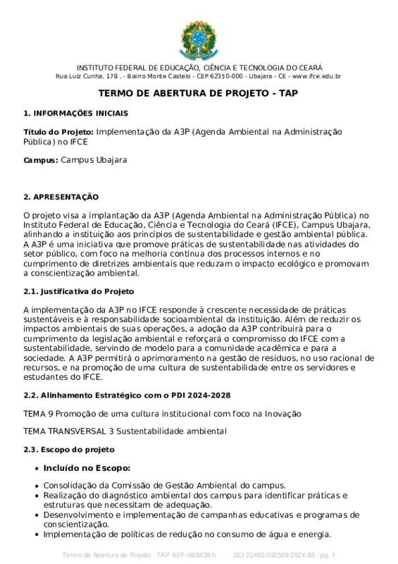 A implementação da A3P no IFCE responde à crescente necessidade de práticas sustentáveis e à responsabilidade socioambiental da instituição. Além de reduzir os impactos ambientais de suas operações, a adoção da A3P contribuirá para o cumprimento da legislação ambiental e reforçará o compromisso do IFCE com a sustentabilidade, servindo de modelo para a comunidade acadêmica e para a sociedade. A A3P permitirá o aprimoramento na gestão de resíduos, no uso racional de recursos, e na promoção de uma cultura de sustentabilidade entre os servidores e estudantes do IFCE.