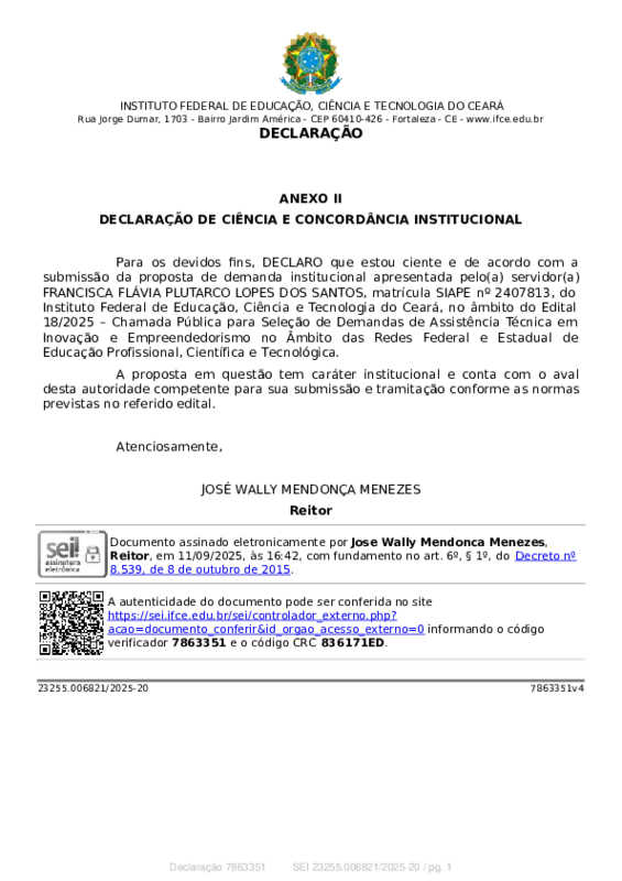 Adesão do IFCE na CHAMADA PÚBLICA PARA SELEÇÃO DE DEMANDAS DE ASSISTÊNCIA TÉCNICA EM INOVAÇÃO, EMPREENDEDORISMO E SUSTENTABILIDADE NO ÂMBITO DAS REDES FEDERAL E ESTADUAIS DE EDUCAÇÃO PROFISSIONAL, CIENTÍFICA E TECNOLÓGICA EDITAL Nº 18/2025 - ASSISTEC INOVA