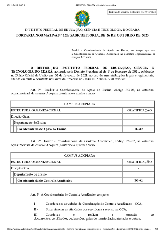 AbertaPORTARIA NORMATIVA Nº 120/GABR/REITORIA, DE 26 DE OUTUBRO DE 2023