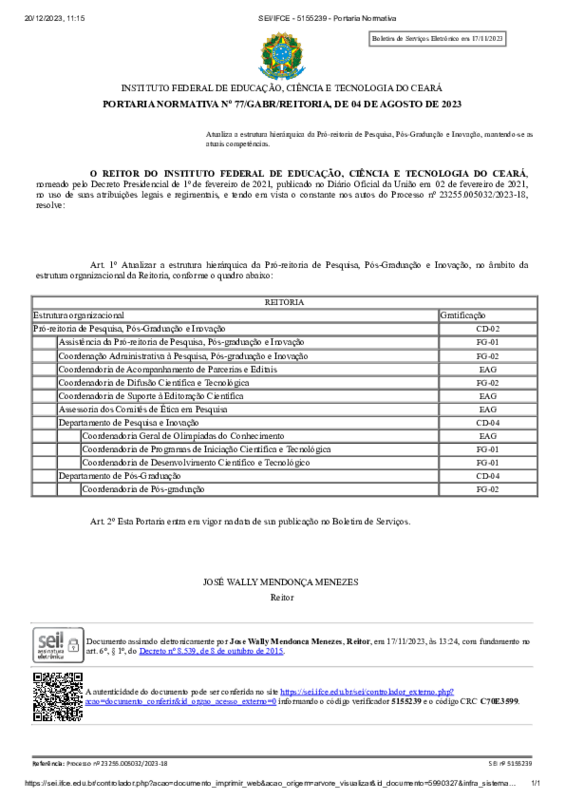 AbertaPORTARIA NORMATIVA Nº 77/GABR/REITORIA, DE 04 DE AGOSTO DE 2023
