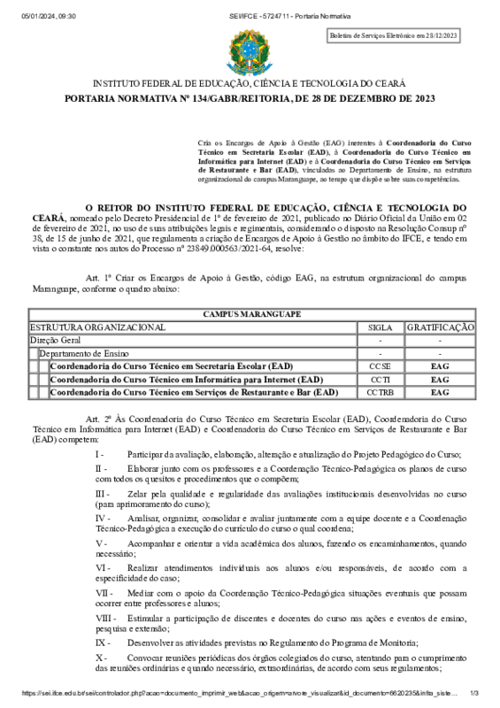 AbertaPORTARIA NORMATIVA Nº 134/GABR/REITORIA, DE 28 DE DEZEMBRO DE 2023