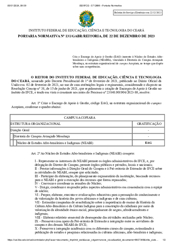 AbertaPORTARIA NORMATIVA Nº 131/GABR/REITORIA, DE 22 DE DEZEMBRO DE 2023