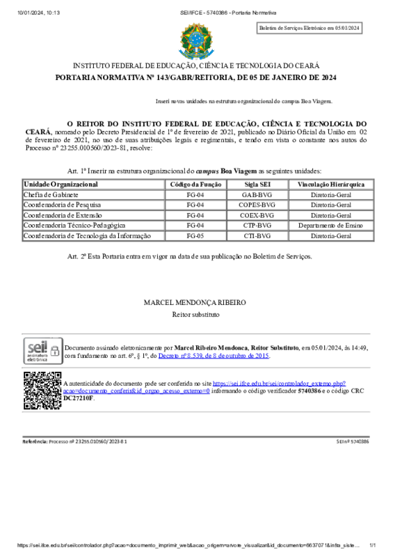 AbertaPORTARIA NORMATIVA Nº 143/GABR/REITORIA, DE 05 DE JANEIRO DE 2024