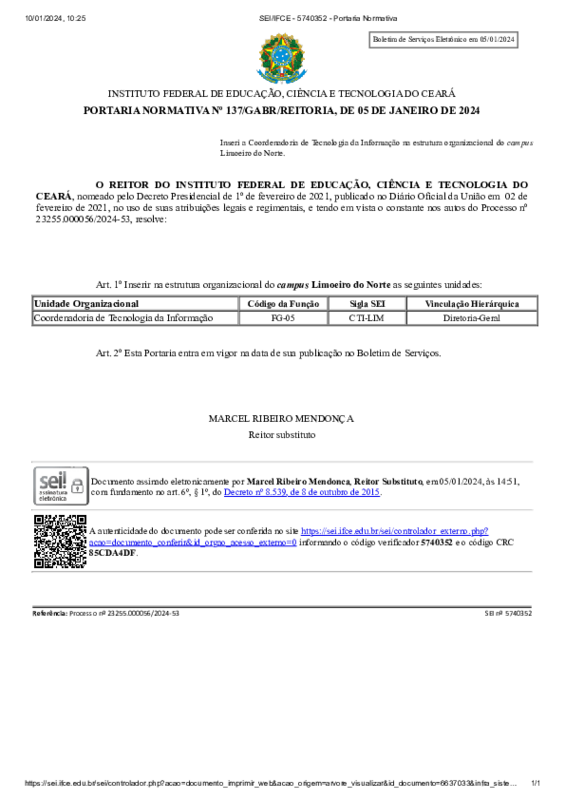 AbertaPORTARIA NORMATIVA Nº 137/GABR/REITORIA, DE 05 DE JANEIRO DE 2024
