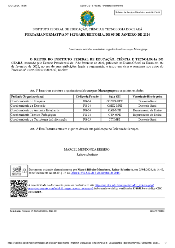 AbertaPORTARIA NORMATIVA Nº 142/GABR/REITORIA, DE 05 DE JANEIRO DE 2024