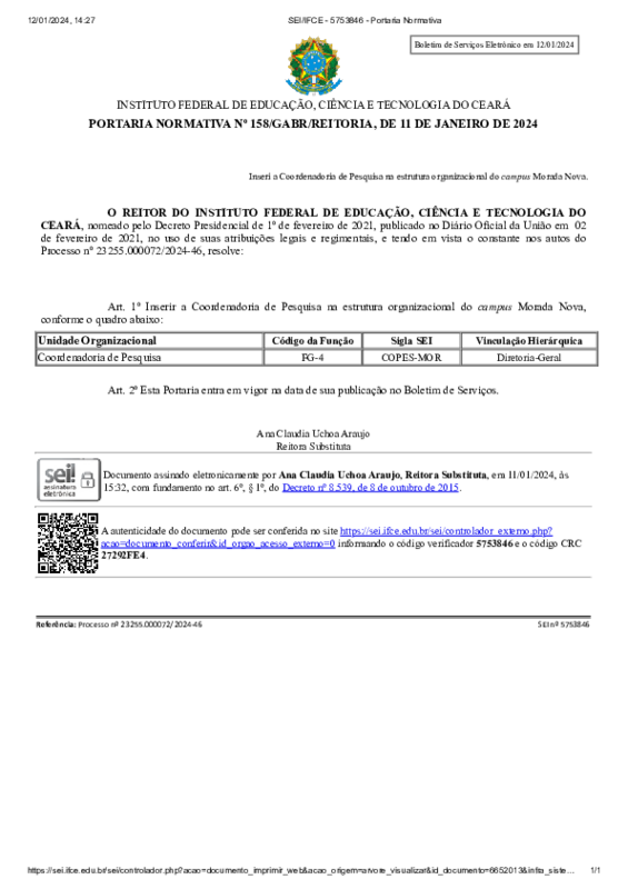 AbertaPORTARIA NORMATIVA Nº 158/GABR/REITORIA, DE 11 DE JANEIRO DE 2024