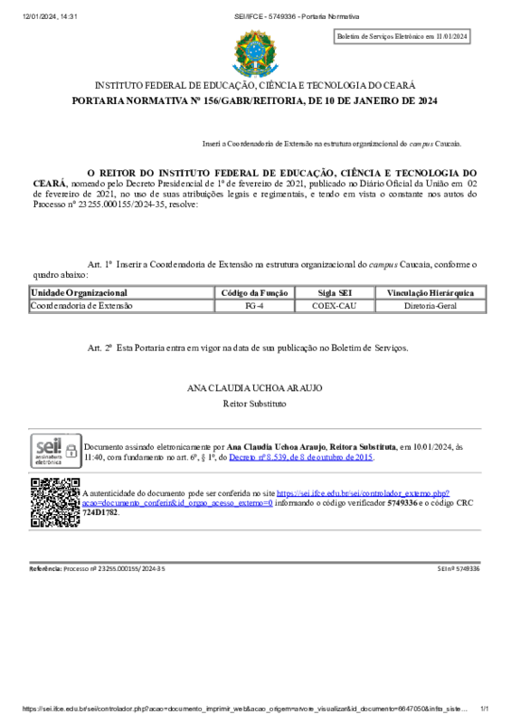 AbertaPORTARIA NORMATIVA Nº 156/GABR/REITORIA, DE 10 DE JANEIRO DE 2024