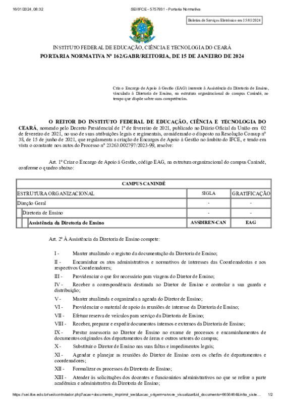AbertaPORTARIA NORMATIVA Nº 162/GABR/REITORIA, DE 15 DE JANEIRO DE 2024