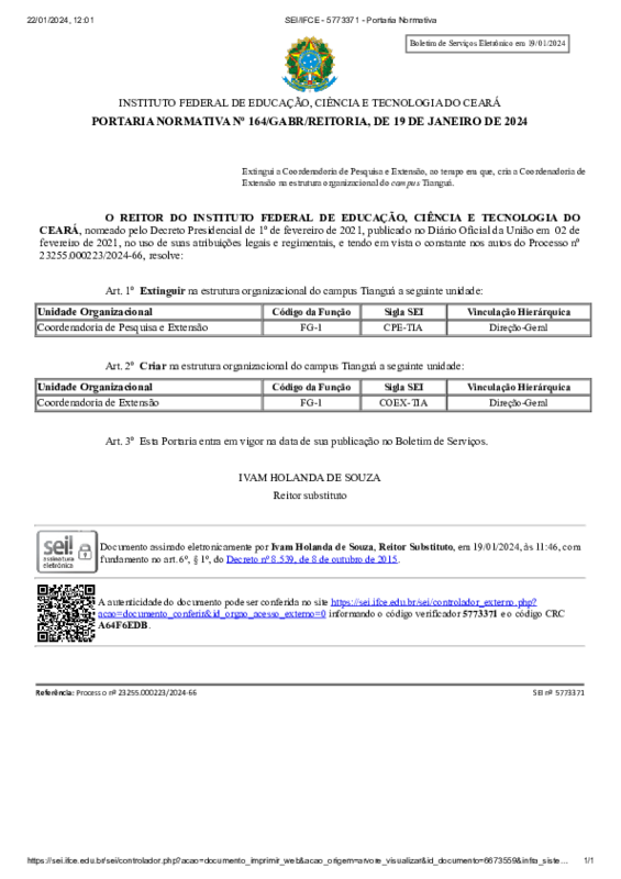 AbertaPORTARIA NORMATIVA Nº 164/GABR/REITORIA, DE 19 DE JANEIRO DE 2024